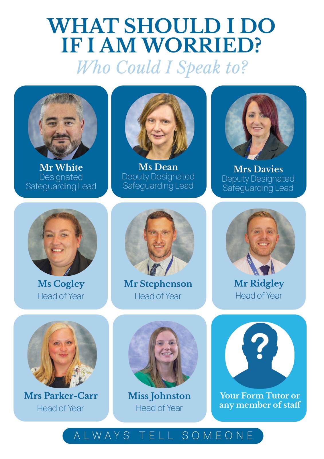 We have a dedicated team of Form Tutors who are able to support your child with any pastoral needs they may have. It is the Form Tutor who will have regular contact with your child through morning R-Time lessons. The Form Tutor should be the first port of call for any concerns or queries regarding your child.