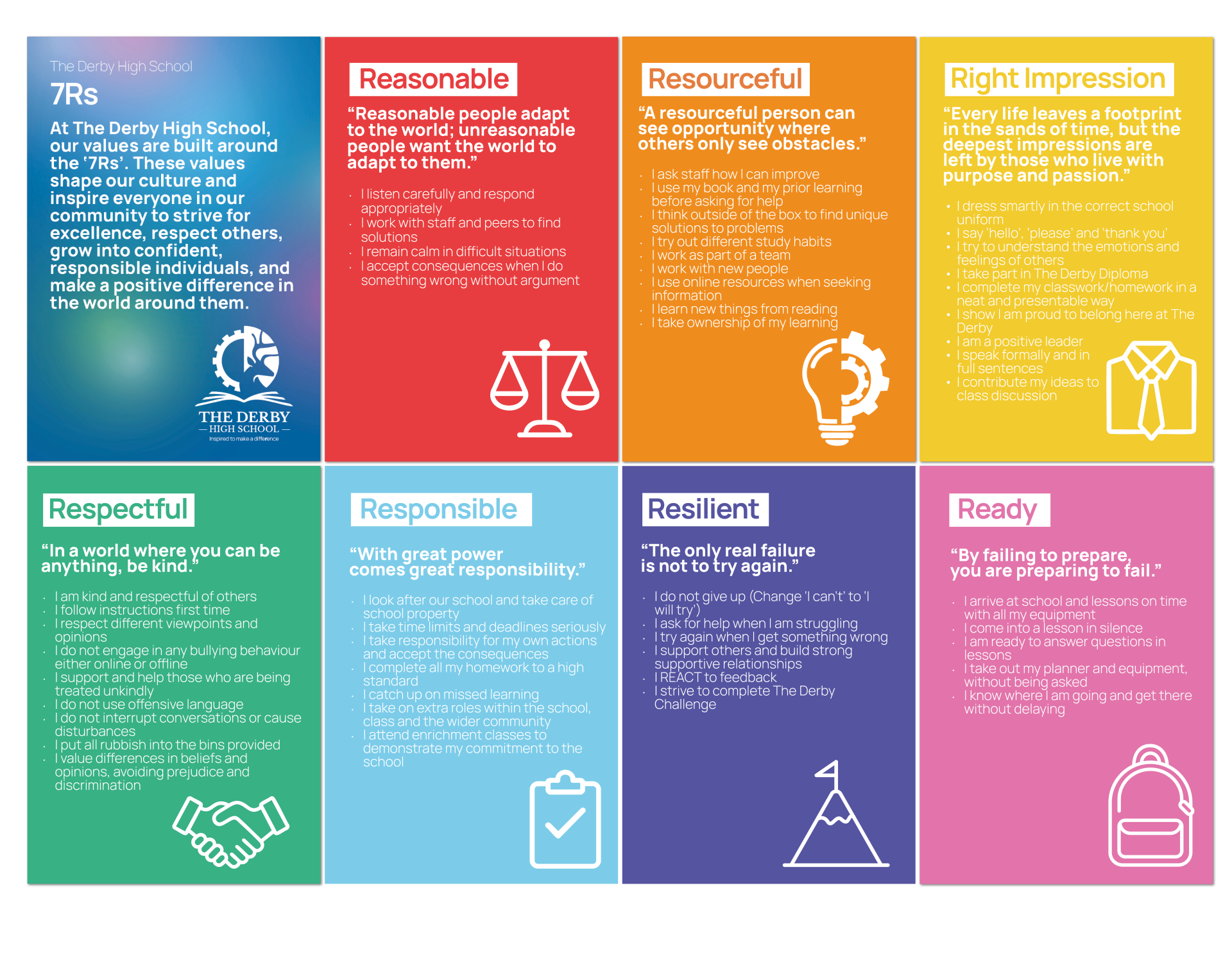 Our school values are built around the ‘7Rs’. We expect and encourage all students to be: