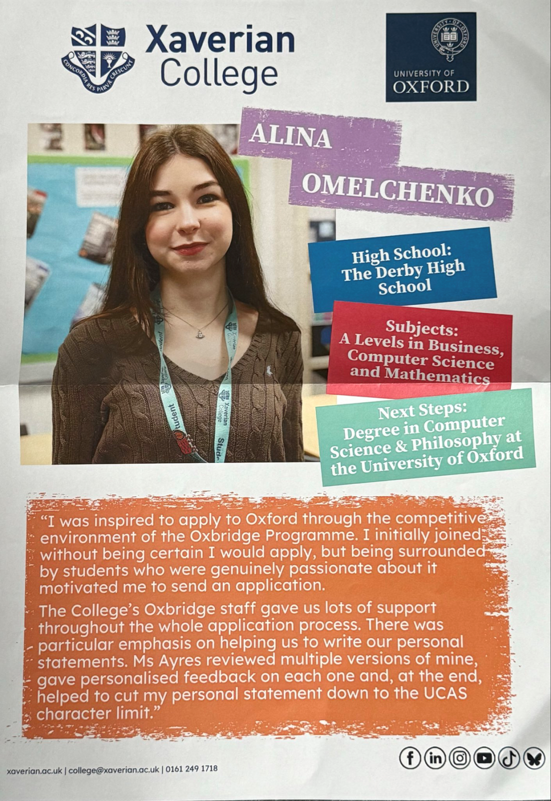 Alina, currently studies A Levels in Business, Computer Science and Mathematics at @Xaverian College. She has secured an offer to study a Degree in Computer Science and Philosophy at the University of Oxford this September.